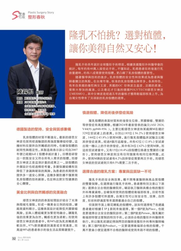媒體活動整形春秋雜誌 2025年第三季 Vol.6 Posted by suzy 2024-12-04 On 2024-12-03 專訪: 陳鍚根醫師 推薦 德國製造Mesmo繆思女神波是黃金比例與自然觸感的完美融合!